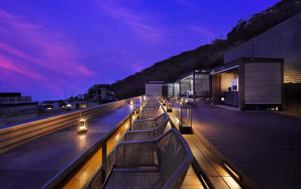 日本3大名段の1つ伊香保石段街の最上段、伊香保神社が鎮座する袂に佇む、『楓の樹』の屋上に設けられた遥か彼方に広がる榛名の山々と伊香保温泉街を一望できるルーフトップバー「空」。