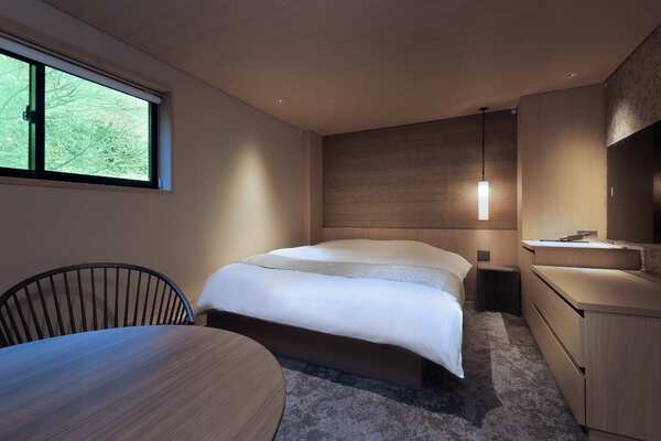 また機能性を考えベットはシモンズセミダブルベットを使用。情緒性と機能性を備えた客室でお寛ぎ下さい。