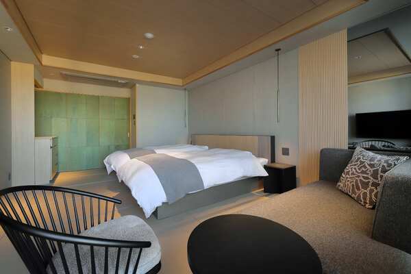 落ち着いた和室風の洋室では畳で寛ぐもよし、ソファーで寛ぐもよし。